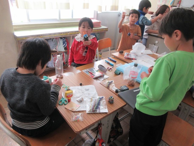 1年生は、生活科の学習で秋のおもちゃづくりをしました。どんぐりや松ぼっくり、落ち葉などを使って、マラカスやけん玉、やじろべえ