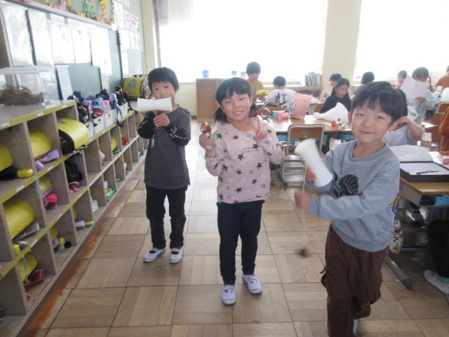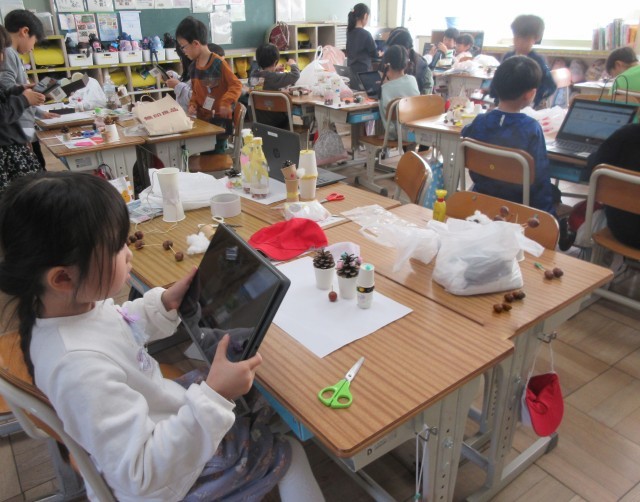 など思い思いのおもちゃを作りました。マラカスやけん玉を作った児童は、上手にやって見せてくれ、うれしそうです。そして、出来上がった作品は、タブレットで撮影しました。