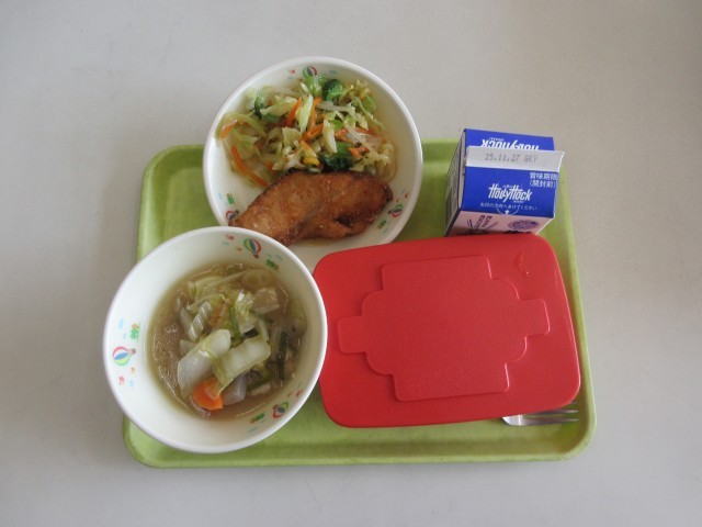 献立 ご飯 牛乳 ほっけの竜田揚げ キャベツと小松菜のあえ物  豚汁