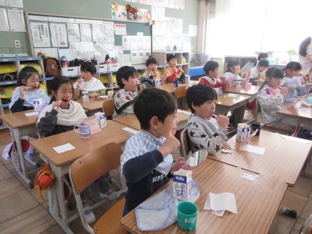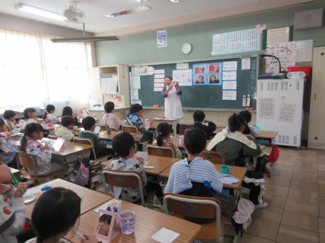 1年生は、歯科衛生士を講師としてお招きし、「歯みがき教室」を実施しました。歯磨きのポイント、歯ブラシの選び方について教わり、また、虫歯にならないために、7つの約束をしました。子供たちは、歯科衛生士の話をよく聞き、実際に歯みがきをして、予防の大切さを学びました。