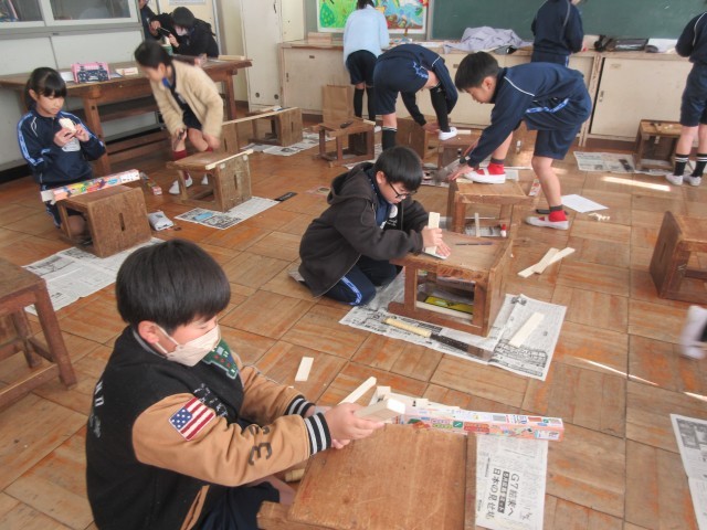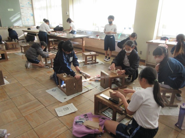 4年生は、図工室で「のこぎり ギコギコ」の製作をしています。3年生では、トンカチを使った作品づくりをし、4年生では、のこぎりを使った作品づくりです。のこぎりの使い方を学習し、安全に注意しながら、それぞれ計画した小物入れづくりに取り組んでいます。完成が楽しみです。