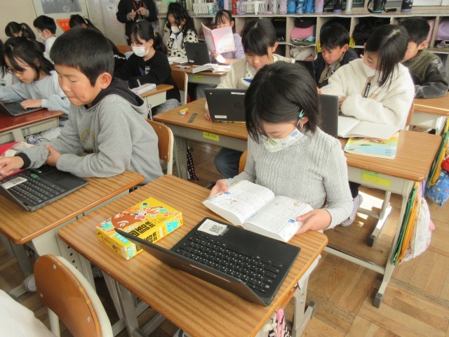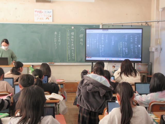 4年生の国語では、慣用句の学習をしています。本時は、慣用句クイズ大会と問題づくりをしました。慣用句を調べ、問題作りをし、答として4つの選択肢も考えました。タブレットを活用し、子供たちは夢中になってクイズに挑戦していました。次時も楽しみ!という声があがりました。