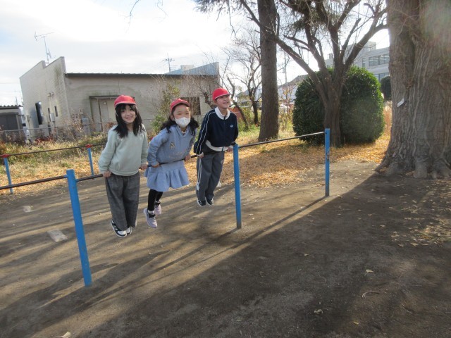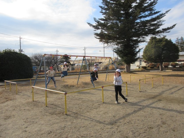 昼休みの様子です。子供たちが竹馬にチャレンジしていました。一生懸命練習しています。ブランコや鉄棒、寒さに負けず元気に外遊びしています。