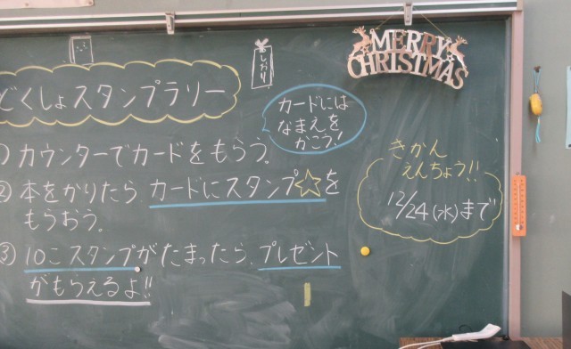 図書ボランティアで図書室の環境整備をしてくださっています。図書室前の掲示コーナーには、12月のおすすめの本が掲示されています。いつも季節に合った掲示物をつくってくださり、ありがとうございます。 また、図書委員会企画の「どくしょスタンプラリー」も12月24日まで延長されました。先日は、かわいらしい手作りのしおりをもらったと、うれしそうに見せてくれました。