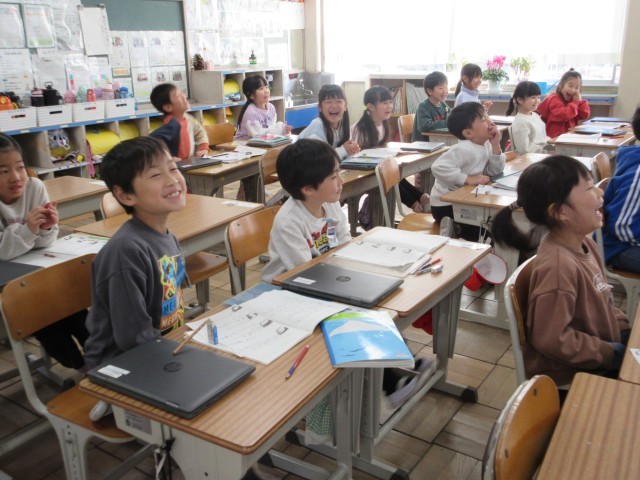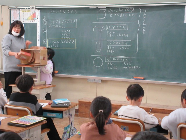 1年生の算数では、箱の形の学習をしました。前時は、たくさんの様々な箱をグループごとに仲間分けし、今日はタブレットで共有しました。箱の形あてクイズでは、特徴をとらえ、どんな形かきちんと理由も答えることができました。