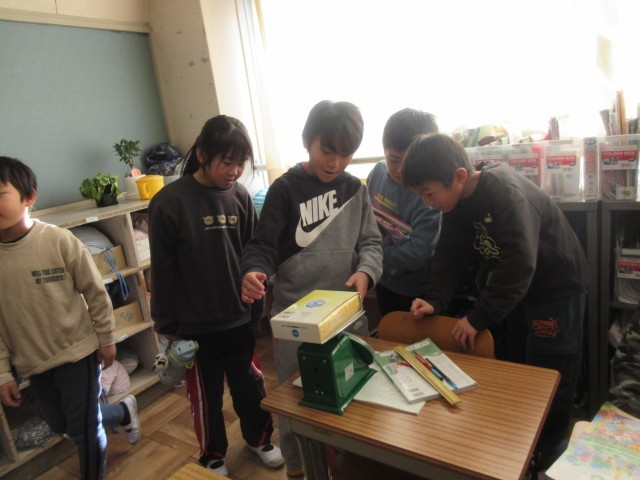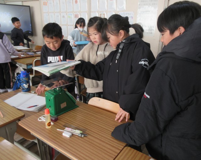 3年生の算数では、重さの学習をしています。本時は、およそ1㎏の物を探して重さをはかり、手にとって重さの感じをつかみとっていました。ぴったり1㎏の物を見つけて、友達と喜び合っていました。