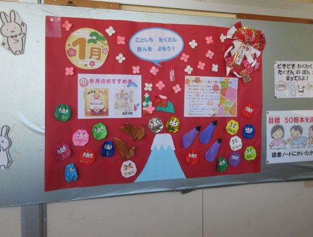 図書室前の廊下には、図書ボランティアによる1月バージョンの掲示物が飾られています。子供たちにたくさん読書に親しんでもらおうと、季節に合わせた掲示物を工夫しながら作製してくださっています。今月のおすすめの本は、「おもちきもち」「14ひきのもちつき」です。
