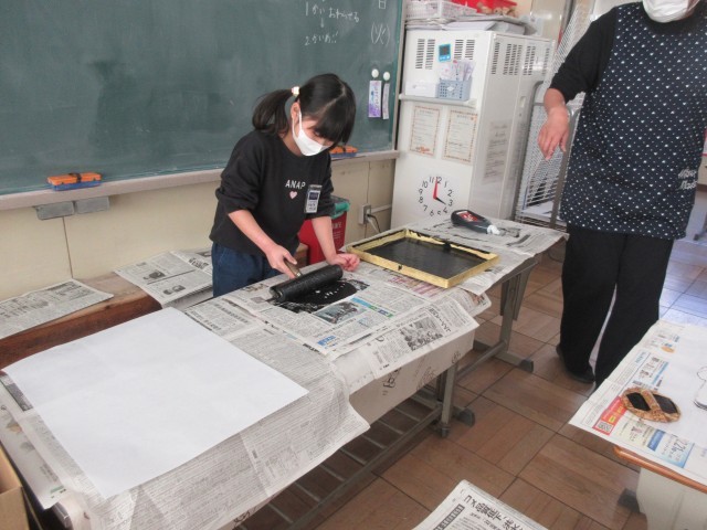 1年生は、図工の学習で、初めての紙版画づくりに取り組みました。ローラーでインクを塗り、バレンで円を描くように動かしながら、押しつけます。みんな上手に刷り上がり、とっても嬉しそうでした。完成した作品は、授業参観の際にぜひご覧ください。