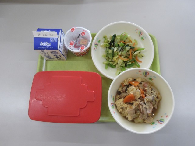 今日の給食は、油で揚げた「油ふ」が入った卵とじ煮です。しっかりと味がしみておいしかったです。