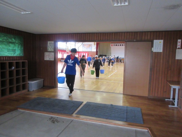 5年生が体育館や昇降口、玄関等の清掃並びに式場準備をしました。みんなで協力して、一生懸命働く姿が見られました。