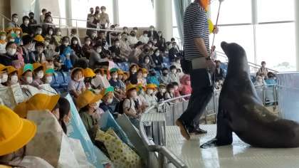 イルカショーでは、アシカやイルカのジャンプに歓声をあげる子どもたち。目をキラキラさせていました。お弁当の時間に使う予定だったレジャーシートも大活躍。しっかり広げて準備万端。最前列の子どもたちは、たくさん水しぶきを浴び、忘れられない思い出になったかな?