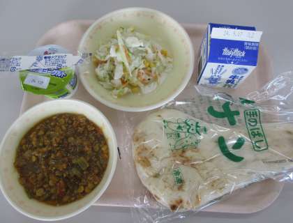 ナン、牛乳、キーマカレー、コールスローサラダ、ヨーグルト