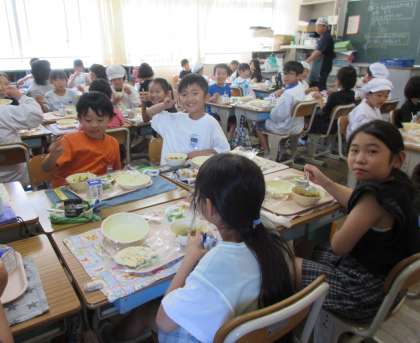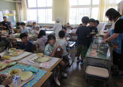給食がスタートして2日目です。教室をのぞくと、友達と楽しく食べている姿が見られました。