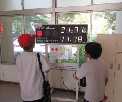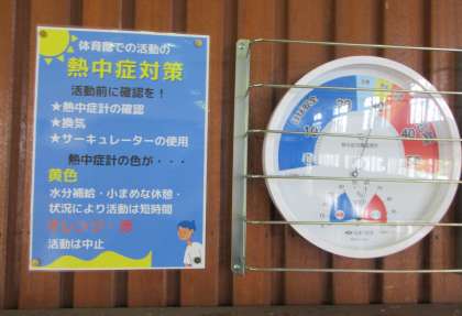 11時を過ぎると気温が上昇し、熱中症計は運動中止の「赤 ピカピカ」マークになりました。養護教諭からエアコンをつけて水分を取ることや換気、サーキュレーターの活用など、校内に放送を入れて、注意喚起しました。