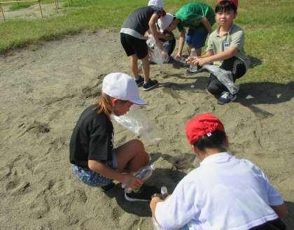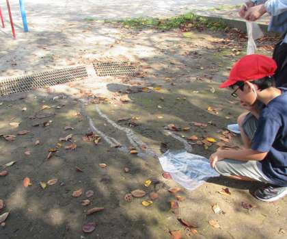 9月11日、4年生は理科「水の流れ」で、校庭にでて学習しました。本時は、「水は、どのような場所に流れていくのだろうか」を考える学習でした。地面の傾きと水の流れる方向を観察し、水は、高い場所から低い場所へと流れることを理解することができました。友達といろいろ試しながら、楽しく問題解決に取り組んでいました。