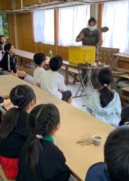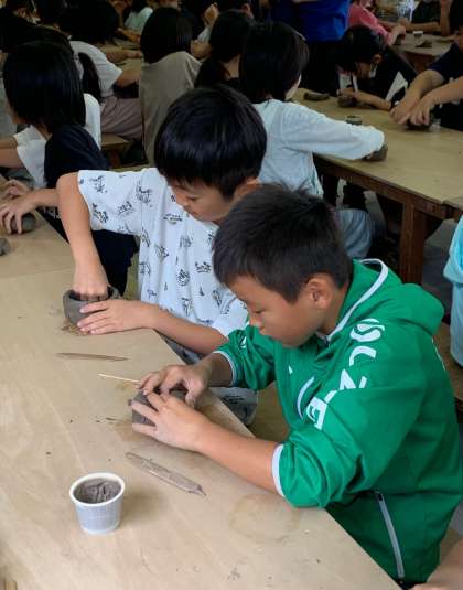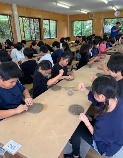 3年生は笠間に到着し、手びねり体験をしています。まず、大津晃窯さんより制作の仕方について説明を聞きました。子供たちは試行錯誤しながら思い思いの作品づくりに夢中になって取り組んでいます。