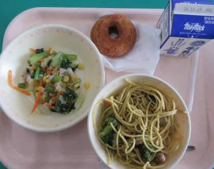 献立 ジェノベーゼスパゲッティ 牛乳 ツナサラダ ドーナツ