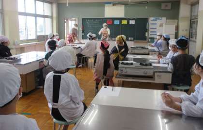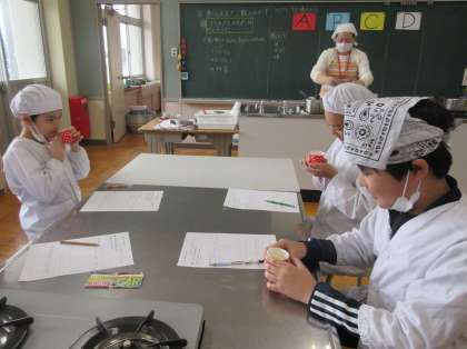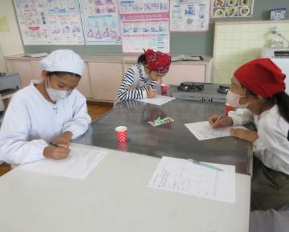 5年生は、家庭科の学習で、担任と栄養教諭での授業を行いました。3つのだし汁(鰹節・昆布・にぼし)を試飲し、色や香り、味の違いについて考え、グループで話し合いました。だしの飲み比べをすることで、だしの役割も知ることができました。