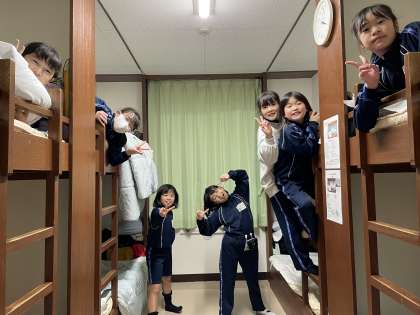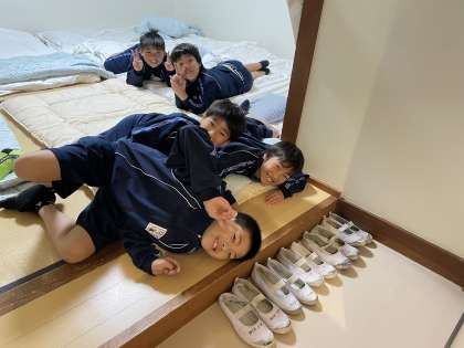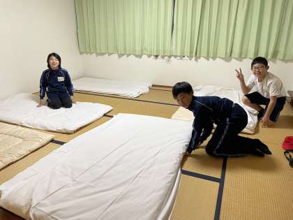 部屋に入り、寝具の準備をしています。みんなとってもうれしそうです。これから、夕食です。