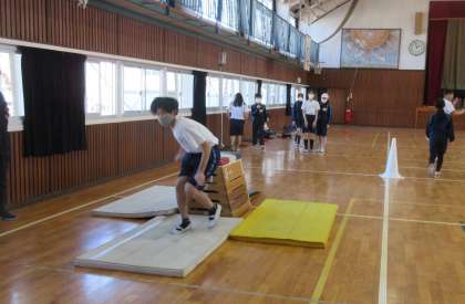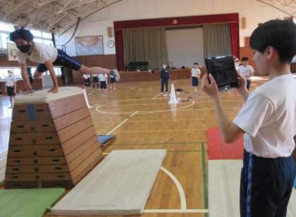 6年生の体育は、跳び箱運動の学習をしています。めあてをたて、練習に取り組んでいます。タブレットで動画を撮影し、ふりかえりに活かしています。