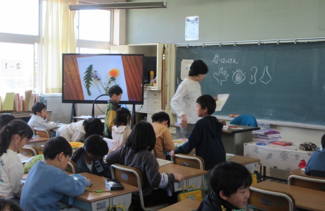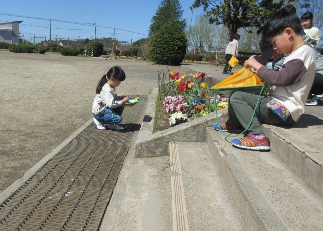 4月16日、2年生は生活科の学習「春見つけ」をしました。探検バッグを持って校庭に出て、たくさんの春を発見しました。カードに絵と文でまとめました。冬と春の違いを五感をはたらかせて気付いたようです。