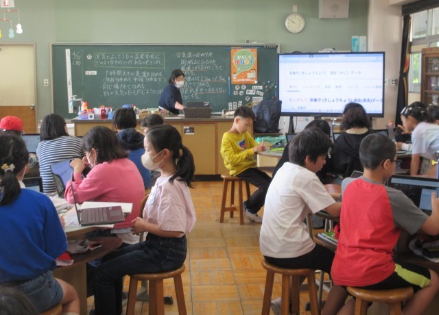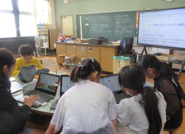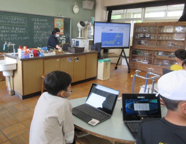 4年生の理科では、「天気と気温」の学習をしました。観察の計画を立て、気温の測り方について学びました。タブレットで、茨城県の過去の気象データを調べると、そのデータに驚きの声が聞こえました。