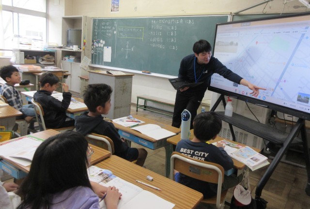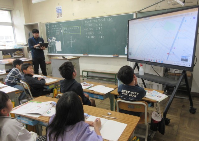 3年生の社会科では、方位、東西南北の4方位の学習をしました。学校の周りにある店舗など、どの方位になるか、地図で確かめました。児童たちは、興味深く学習に取り組んでいました。。