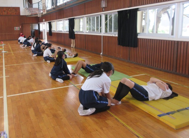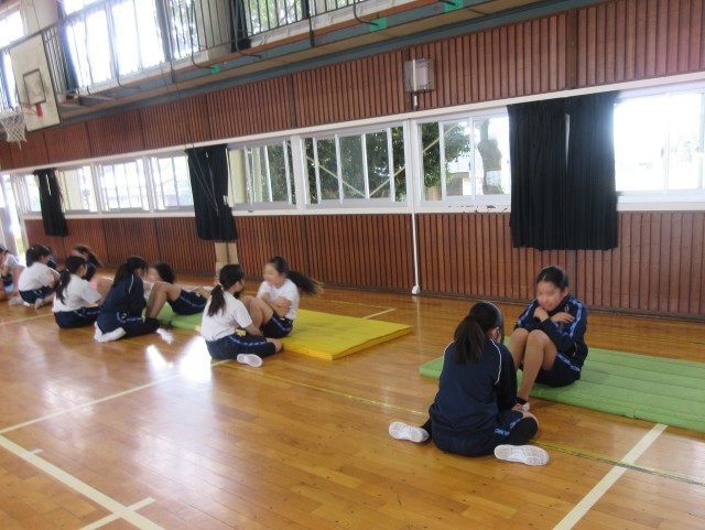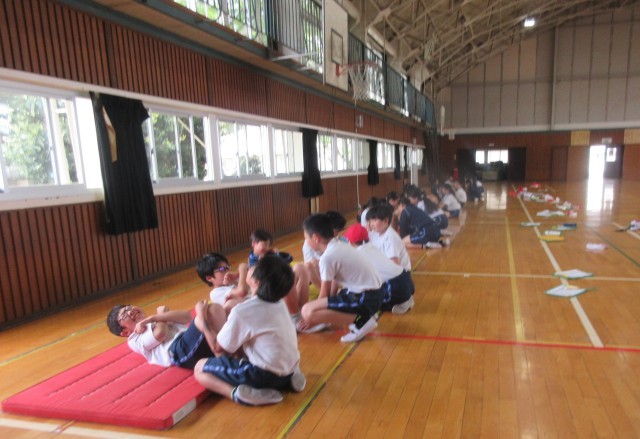 6年生の体育の時間は、体育館で体力テストを実施しました。本日は、反復横とびと上体起こしをペアになって行いました。昨年度よりも記録が伸びるよう、目標をもって取り組んでいます。