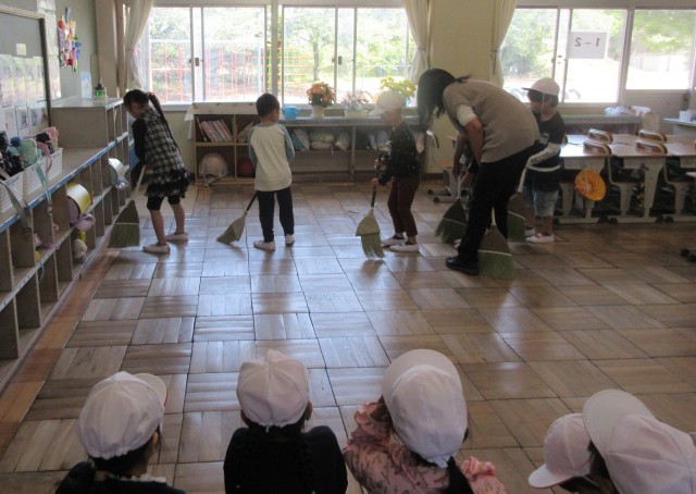 1年生は、掃除の仕方を、練習しました。ほうきのはき方、雑巾の拭き方を一つ一つ確認しました。床のマス目に沿って、丁寧に掃くことができました。友達のはき方のいいところも見つけることができました。掃除の仕方を覚えて、友達と協力しながら学校をきれいにしていきましょう。