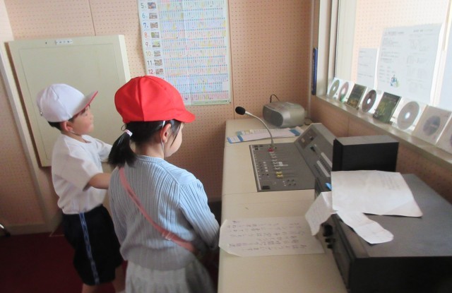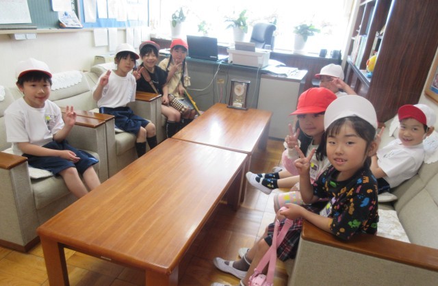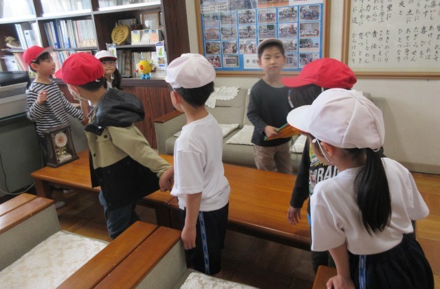 1年生と2年生が交流会をし、2年生が案内したい場所に連れて行ったり、一緒に遊んだりして1年生と一緒に楽しく過ごしました。2年生が1年生を案内して、校長室にやってきました。1年生は、初めて入る校長室にどきどきです。校長室をきょろきょろして、「合い言葉だ!」と掲示してある市毛小の合い言葉も見つけることができました。仲良く手をつないで、放送室や理科室など1年生に優しく声かけしながら案内できました。