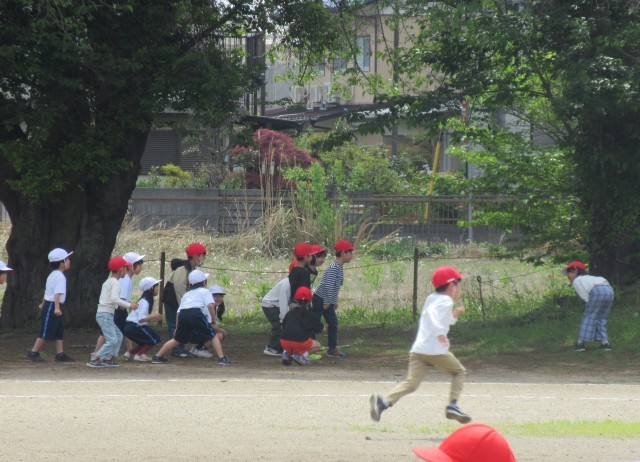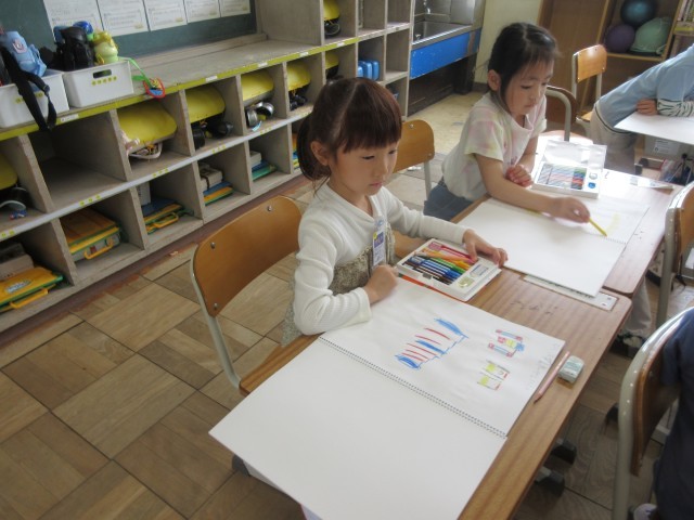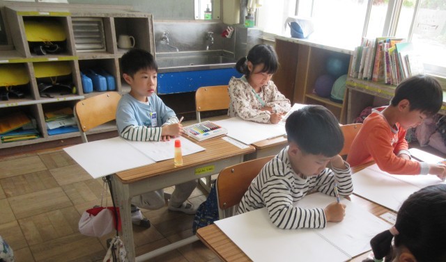 運動場では、2年生と1年生がおにごっこをしたり、だるまさんがころんだをしたり、遊具で遊んだりしました。教室に戻った1年生は、2年生と一緒に遊んだことを思い思いに絵に描き、楽しかったことを振り返っていました。