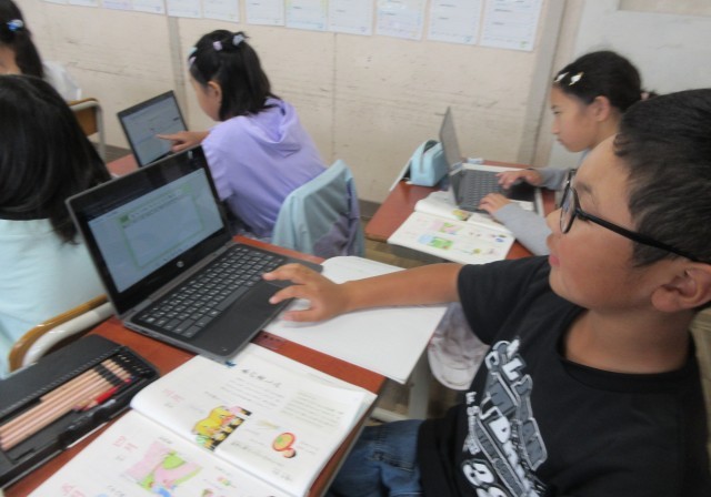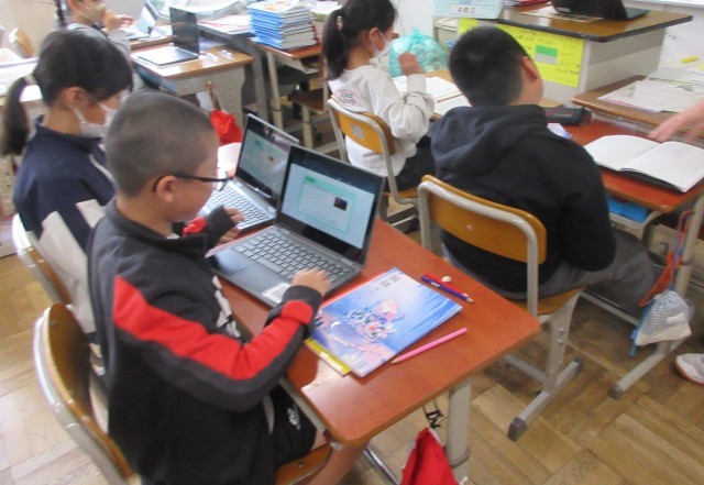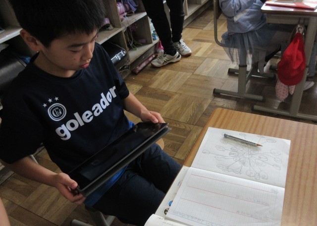 ノートに書き出します。次に、ノートをタブレットで撮影し、教師にオクリンクプラスで送り、全体で共有します。児童は「春」をイメージする言葉を意欲的に見つけていました。振り返りは、タブレットに入力し、教師に送信するなど、タブレットを効果的に活用していました。