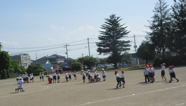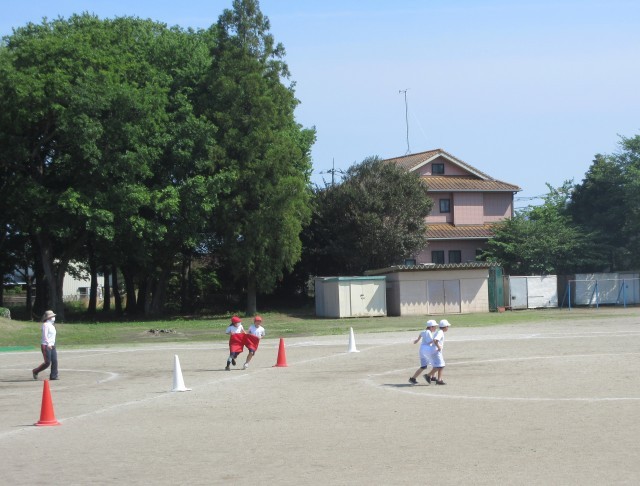 4年生は、団体種目「でかパンリレー」の練習をしました。紅白それぞれのペアが、大きなズボンに入って走ります。息をぴったり合わせ、上手に走り切るのは、紅白どちらの組でしょう。チームの応援も盛り上がっていました。