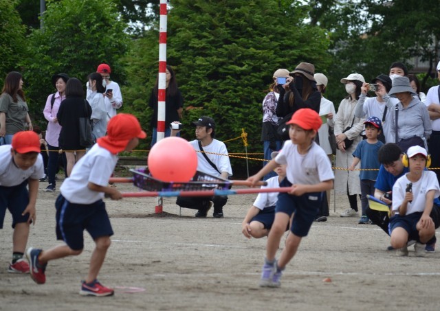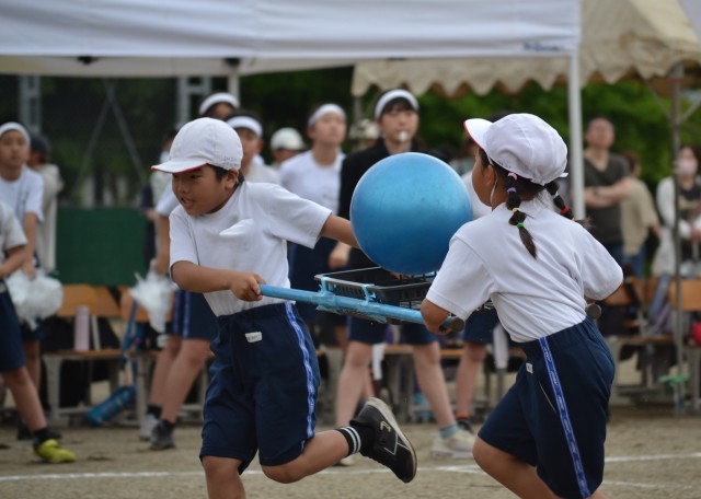 2年生の団体種目「力を合わせて」では、二人一組で力を合わせ、上手にかごに乗せたボールを運びました。最後まで勝利をめざしててがんばりました。