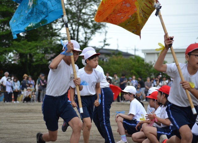 6年生による団体競技「団結フラッグ!!2025」では、各色ごとに6年生が作成した大旗を持って力いっぱい走りました。各大旗には児童の願いが込められています。見事な旗を持って走り、チームにつなげました。