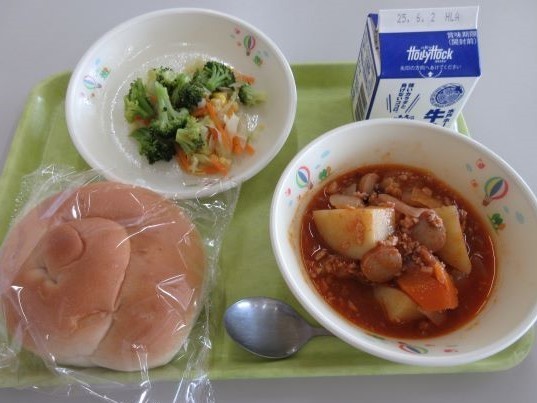 ミルクパン 牛乳 チリビーンズ ブロッコリーとコーンのサラダ