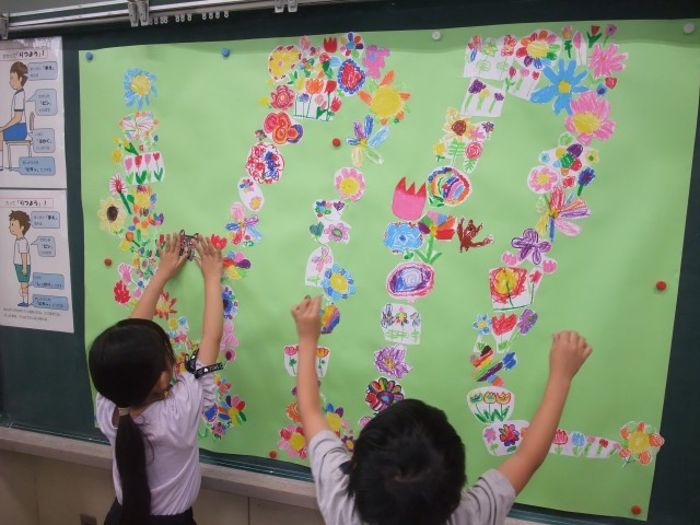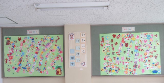 1年生の掲示コーナーには、「はなのみち」を掲示してあります。国語科の「はなのみち」の学習を活かして、自分たちの「はなのみち」を楽しくつくりました。