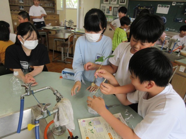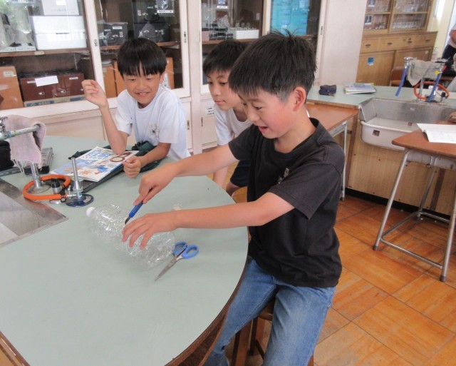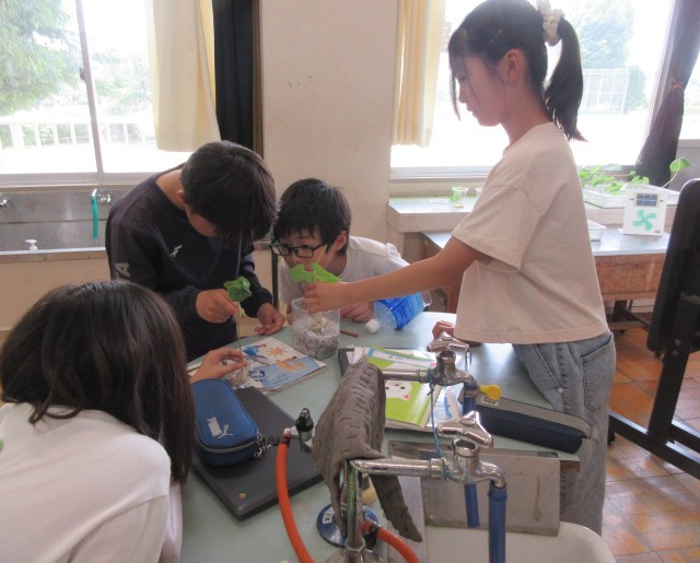 5年生の理科「植物の生長の条件」の学習をしました。ペットボトルを活用したインゲン豆の鉢作りをして、インゲン豆の植え替えをしました。動画で作り方を学んでから、グループの友達と協力して作っていきました。植物の成長にはどのような条件が関係するのか調べていきます。
