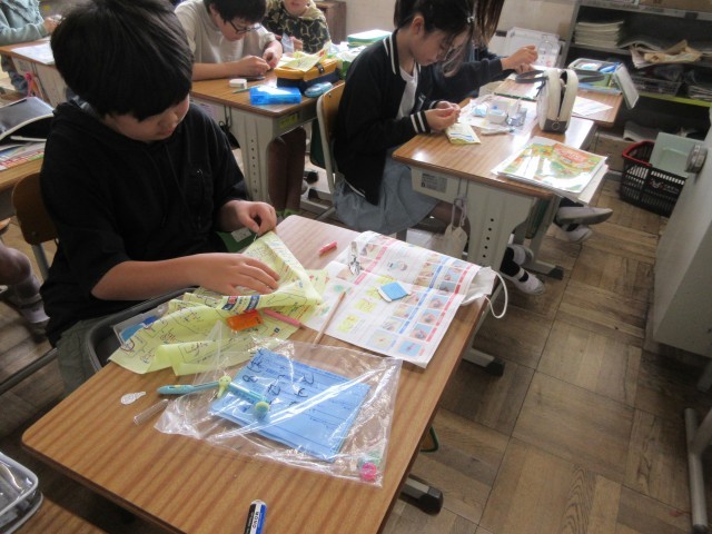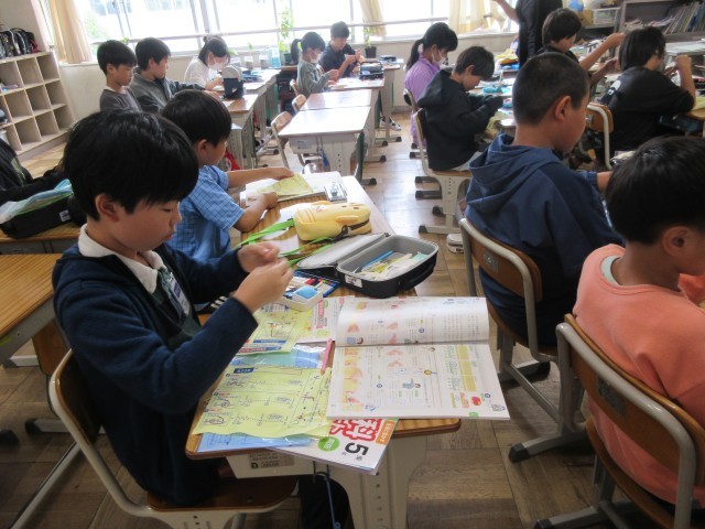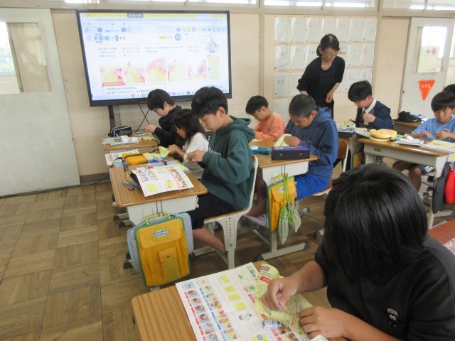 5年生は4月から家庭科が始まり、裁縫の学習をしています。手縫いの基礎である玉結び・玉どめ・並縫いなどを学習します。本時は、自分の名前のぬいつけをしました。チャコペンシルで下書きをしてから、一針一針丁寧に縫い付けていました。基礎をマスターして、これからいろんな物作りに挑戦したいですね。