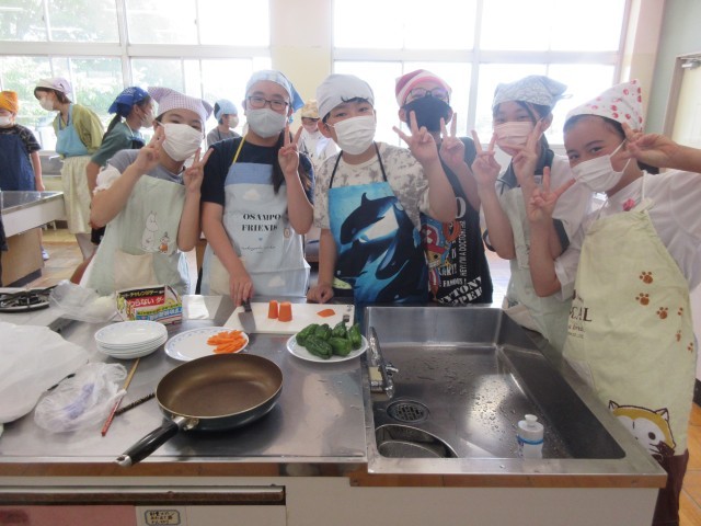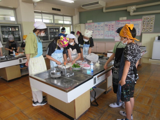 6年生は、調理実習をしました。「炒める調理で朝食のおかず」づくりです。野菜を洗う、切る、炒める、味付け、盛り付けの順にグループで協力しながら実習しました。にんじんとハムはたんざく切りに、ピーマンはせん切りに、玉葱は薄切りに同じ大きさにそろえて、丁寧に野菜を切っていました。
