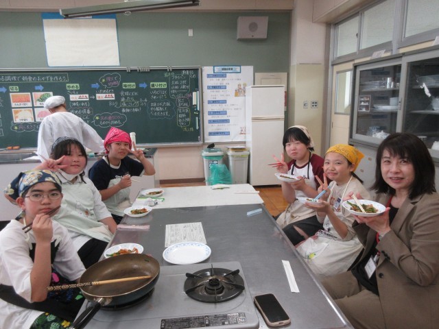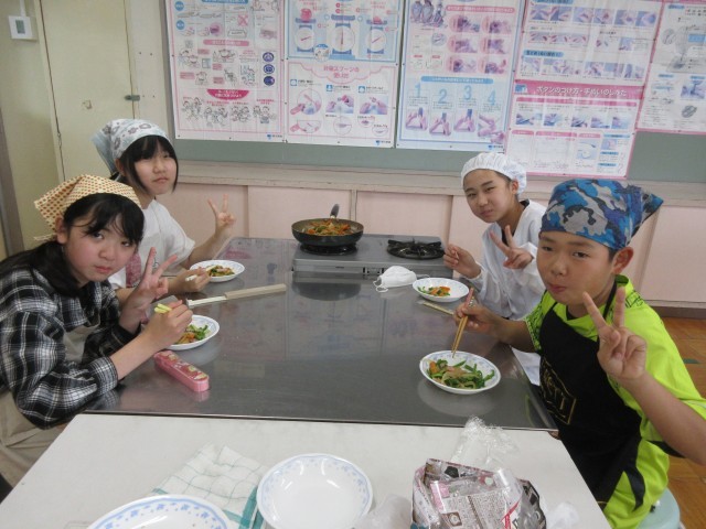 本日は、6年生が調理実習をしました。ピーマンや人参、玉葱、ハムを上手に短冊切りにして、炒めました。校長も試食をすすめられ、おいしくいただきました。味付けもちょうどよかったです。ぜひ、お家でもつくってみてください。