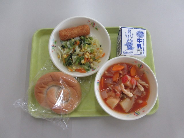 献立 こめパン 牛乳 お魚ソーセージフライ コーンサラダ 具だくさんトマトスープ