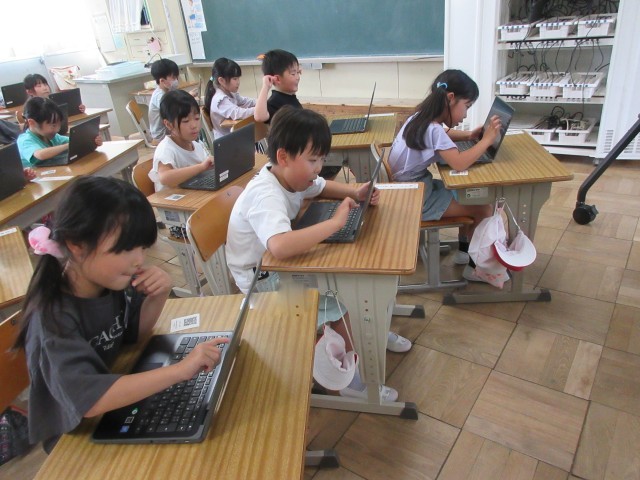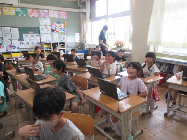 本日、ICT支援員の先生が来校し、文字の書き方を教えてもらいました。テーマは、「昼休みに遊んだこと」です。子供たちは、指で「こおりおに」「おにごっこ」「ジャングルジム」などを書いて、先生に送りました。「できた!」と、みんなうれしそうでした。最後にみんなのカードを共有したときは、「すごい!」と、歓声が上がりました。興味をもってタブレット学習に取り組んでいます。