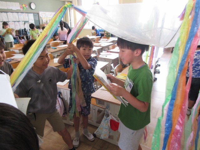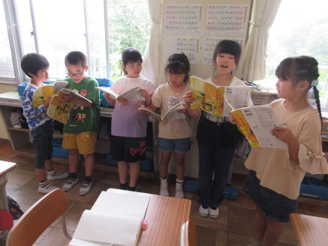 2年生の国語では、物語文「スイミー」の学習をしています。音読をするにあたり、音読の工夫とその理由をノートに書きだしました。グループごとに役割分担をし、登場人物になりきって、感情豊かに楽しく音読練習に取り組んでいました。写真右の傘は、「にじいろのようなくらげ」を表しています。