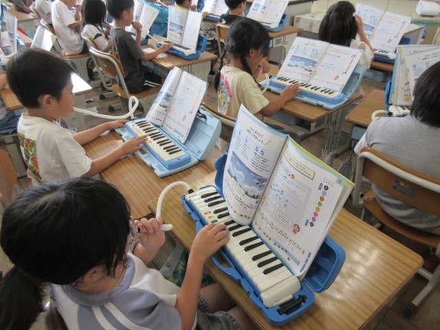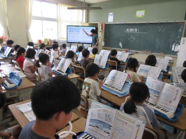 2年生の音楽の授業の様子です。「ぷっかりくじら」の曲を、教師の合図に合わせ、鍵盤ハーモニカで練習しました。指の動かし方に注意しながら、上手にみんなで音を奏でていました。