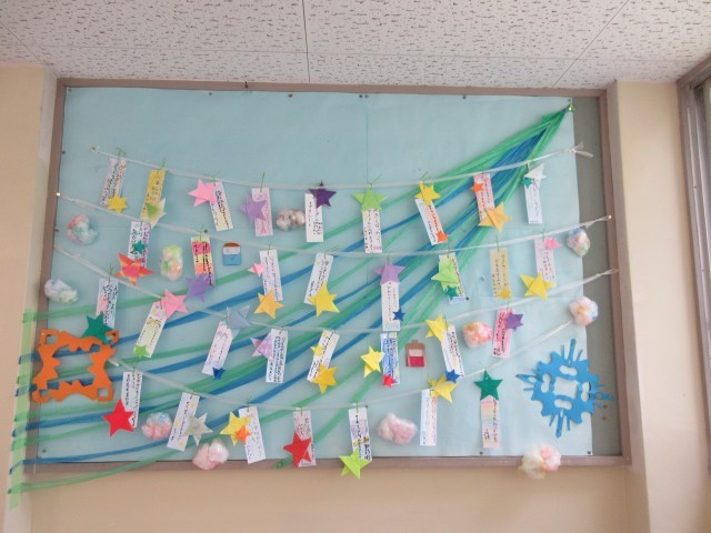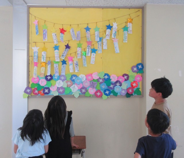2年生の掲示コーナーには、七夕の短冊が飾ってあります。一人一人短冊に願いごとを書きました。将来の夢や家族の幸せを願う気持ちなども見られます。写真は、休み時間にお友だちの短冊を興味深く読んでいる様子です。みんなの願いがかないますように。