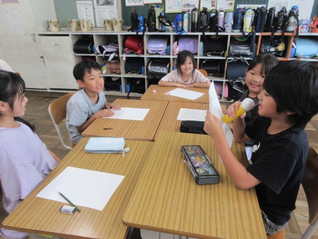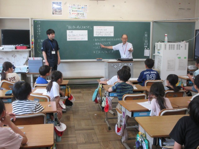 教育研究所の学級経営アドバイザーをお招きし、担任とのティームティーチングによる授業を行っていただきました。話し合い名人になるためのポイント、「3つのコツ」を使いながら、グループで楽しく伝え合いました。