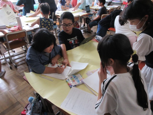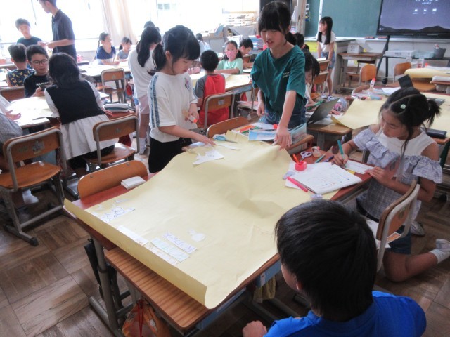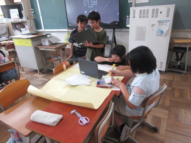 4年生は、クリーンセンターへ見学してきたことをテーマに、新聞づくりに取り組んでいます。レイアウトを考えたり記事を考えたりとグループのメンバーと意見を出し合い、役割分担をして協力しながら取り組んでいました。