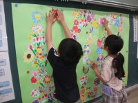 2年生は、図画工作の学習で透明板にステンドシールを思い思いに貼って、「光のプレゼ...