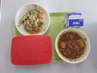 給食のカレーについて知ろう献立 ご飯 牛乳 ポークカレー こんにゃくサラダ...